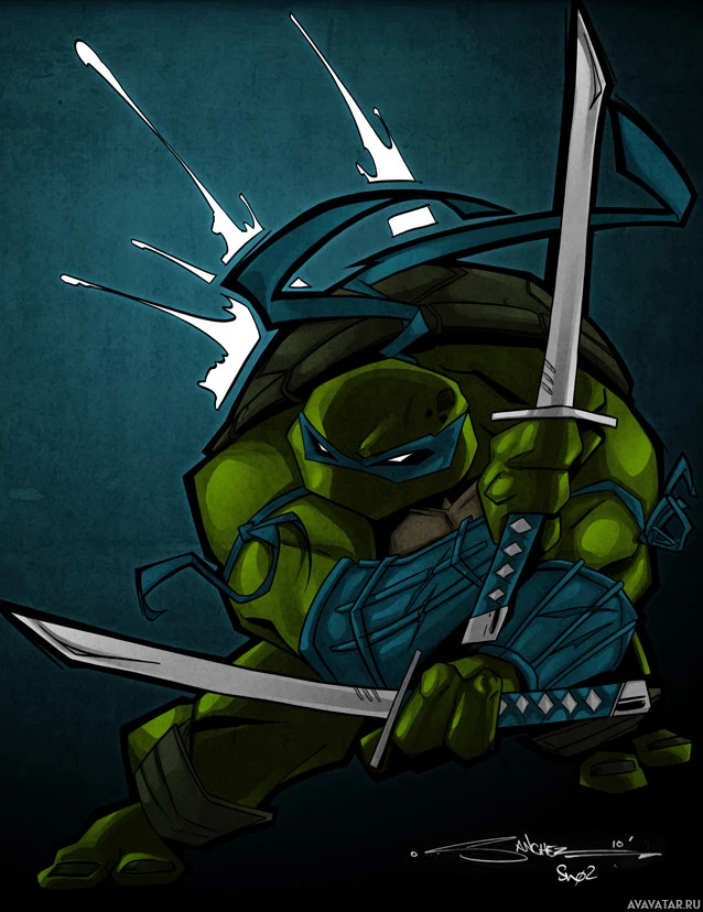 The image shows an illustration of a character known as Leonardo from the Teenage
