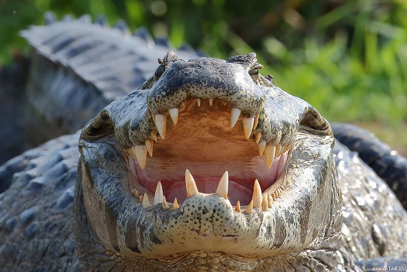 На картинке изображен крокодил с открытой пастью, обнажающей острые зубы. Это изображение животного, а именно крокодила, который известен своими мощными челюстями и способностью ловить добычу в дикой природе.