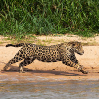 The image shows a jaguar (a type of big cat) running along the edge of a body of water. The background includes vegetation, suggesting this might be in a natural habitat such as a rainforest or savanna where jaguars are typically found.