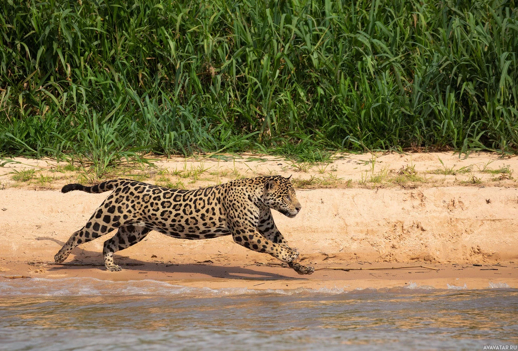 На картинке изображен ягуар (тип большой кошки), бегущий по краю водоема. Фон включает в себя растительность, предполагая, что это может быть в естественной среде обитания, такой как тропический лес или саванна, где обычно встречаются ягуары.