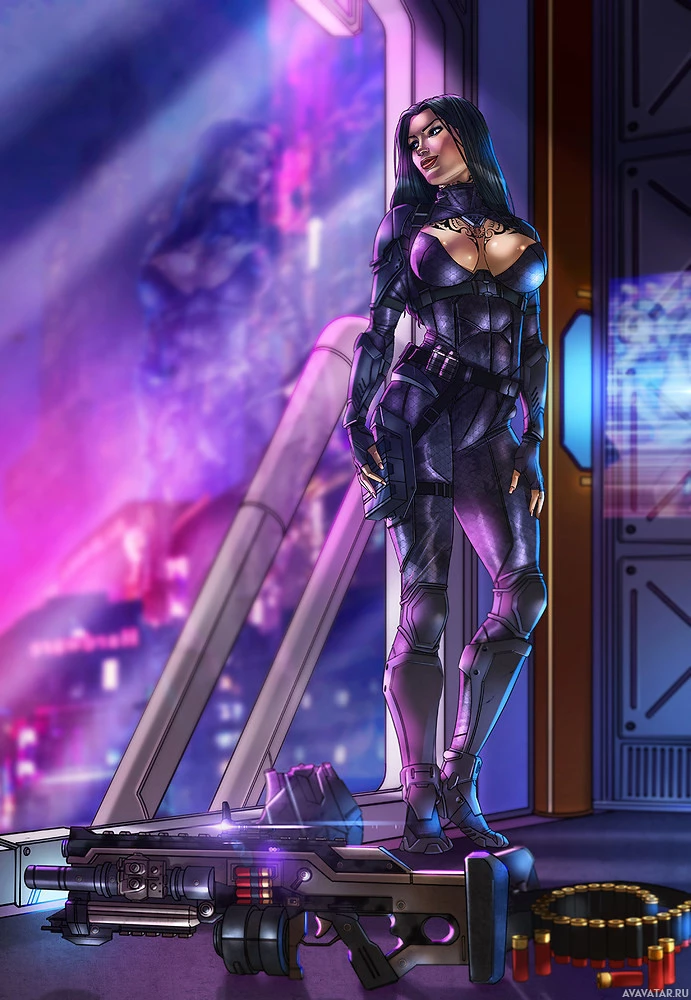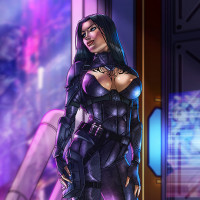 dark hair, dressed in futuristic or sci-fi attire. She is standing inside what looks like