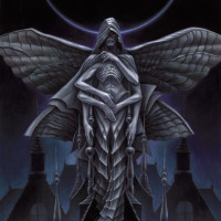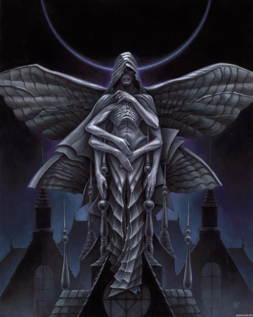outstretched wings like an angel, while its lower body resembles a spider or some other arachnid creature. The figure is surrounded by