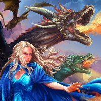 a dynamic pose with her hair flowing behind her, and she is looking into the distance. Behind her are three dragons of
