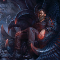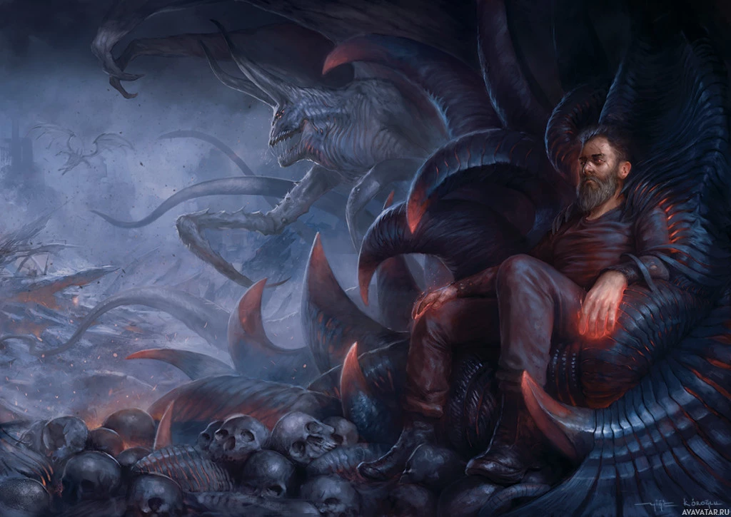 a fantasy scene with several elements. In the foreground, there is a man with a beard and mustache sitting on a throne-like structure that resembles