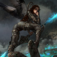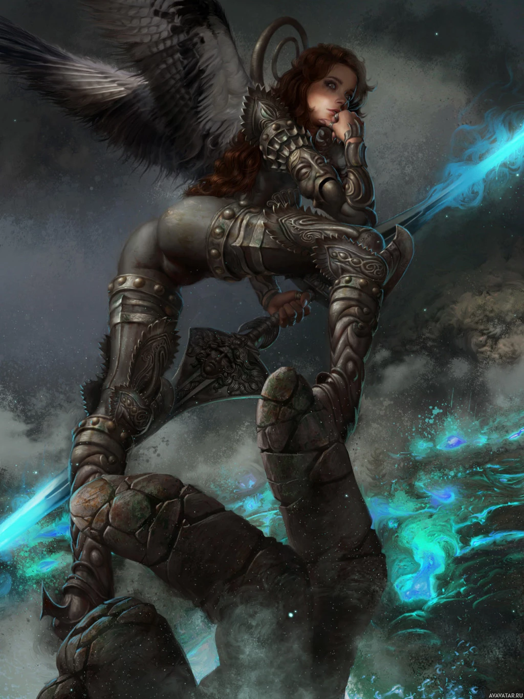 a fantasy scene with an angel-like figure. The character is shown from behind, wearing armor and holding a sword. She has wings and stands confidently on the back of