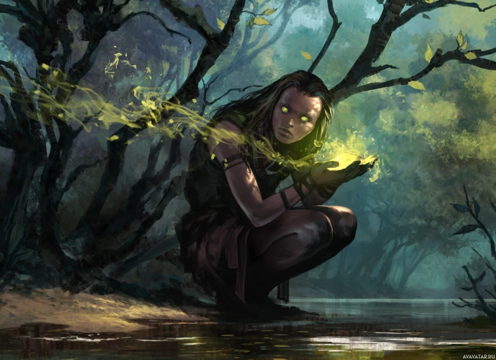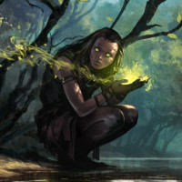 a fantasy scene featuring a figure squatting near water, surrounded by natural elements like trees and plants. The character appears to be in a mystical or magical setting, possibly engaged in some sort of enchantment or spellcasting given the glowing substance in their hand and