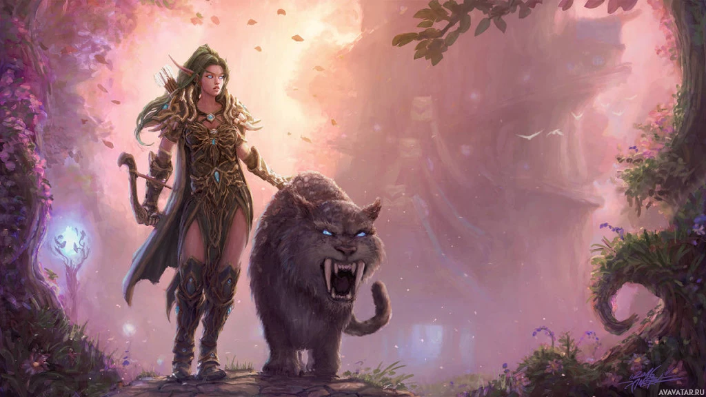 the Warcraft universe, which is a series of games developed by Blizzard Entertainment. The elf is holding what looks like a staff and has a confident posture, standing in front of
