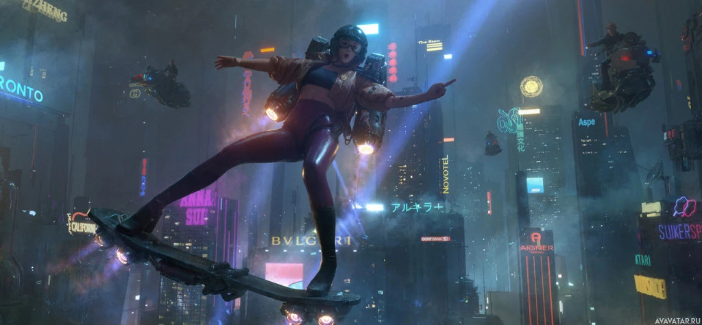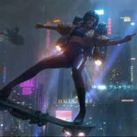 a female character in a futuristic science fiction setting. She appears to be in motion, possibly skating or running through an urban landscape that is heavily influenced by
