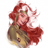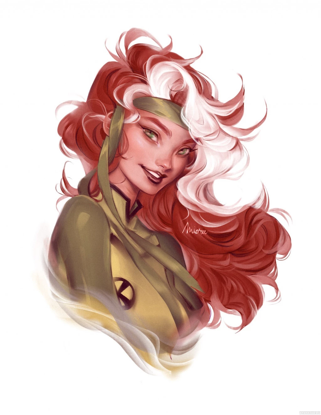 red hair and white streak, wearing her trademark green top. The art style appears to be digital and it has a soft, somewhat stylized look.