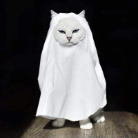 The image shows a cat with a white sheet or fabric draped over its head, giving it the appearance of being a ghost. This is often done for humorous effect or to create a costume for an event like Halloween.
