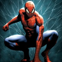 The image shows Spider-Man, a fictional superhero character from comic books published by Marvel Comics. He is depicted in his iconic pose of crouching on a building ledge or rooftop with his hands outstretched, ready to swing into action.