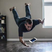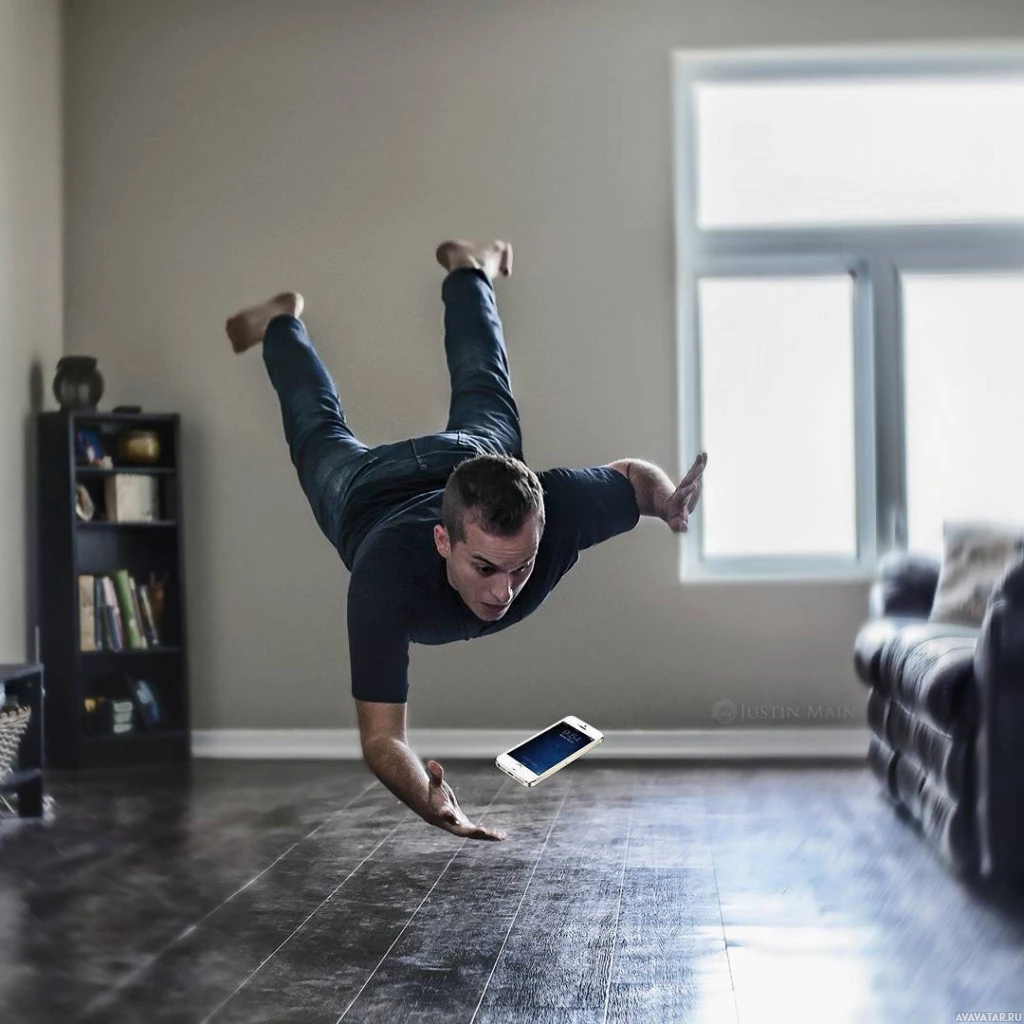 In the image, there is a man who appears to be diving or jumping in an attempt to catch a phone that has been thrown into the air. The setting looks like