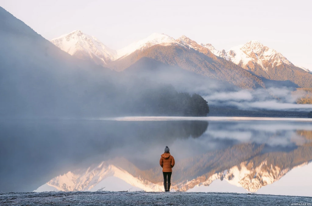 a body of water, looking out towards a mountainous background with misty peaks. It is not explicitly clear if the person is a girl or not from this angle. The location appears to be a serene,