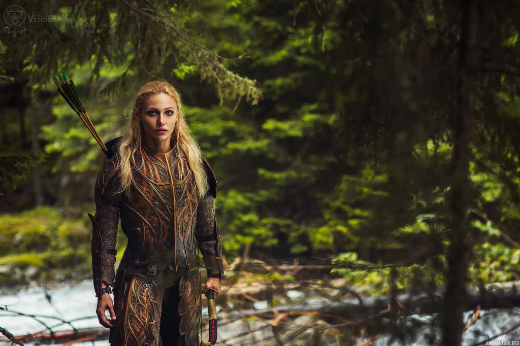 a fantasy outfit resembling an elf. They are standing in