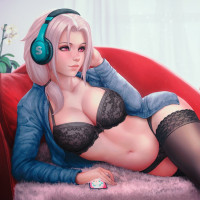 blonde hair, wearing headphones. She is sitting in a red chair, wearing