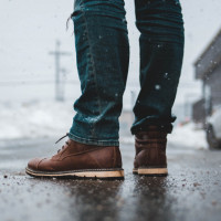 The image shows a person walking on a wet street. They are wearing brown boots which appear to be waterproof, suitable for the snowy conditions depicted in the photograph. It's a typical winter scene with people dressed appropriately for cold and potentially slippery weather.