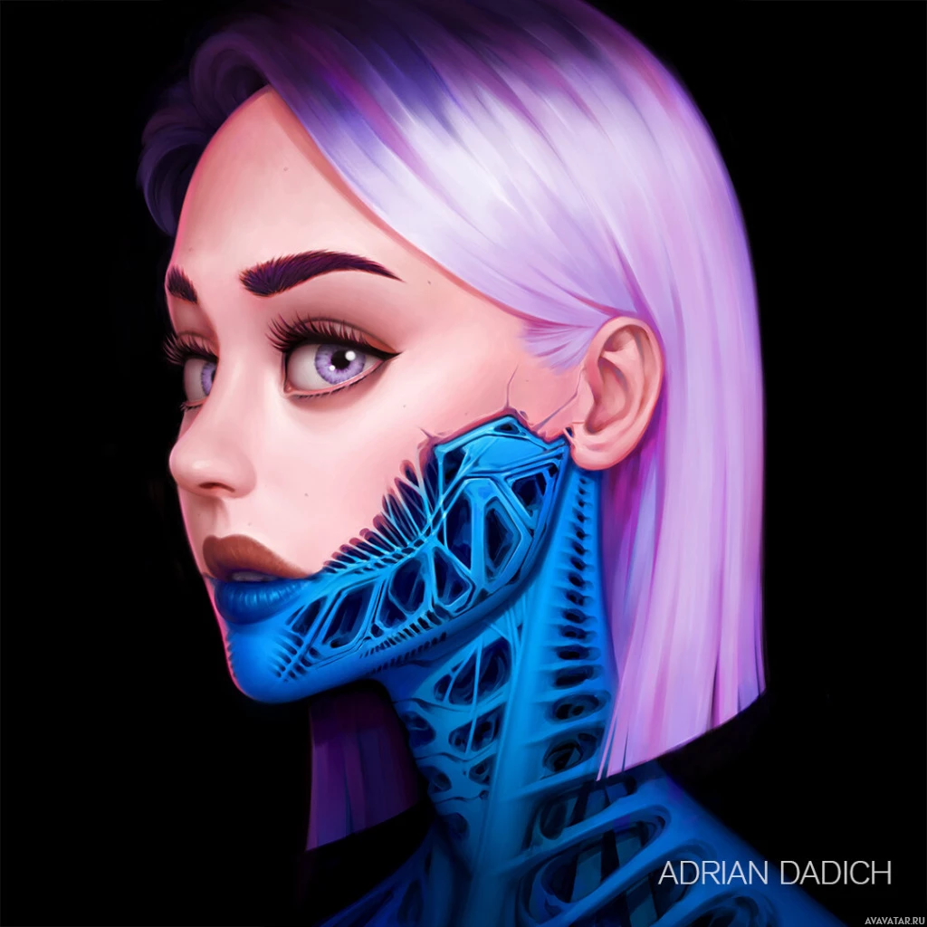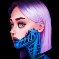 cyberpunk aesthetic of the artwork. Her expression is contemplative or intense, as if she's focused on something out of frame. The background is dark, contrasting with