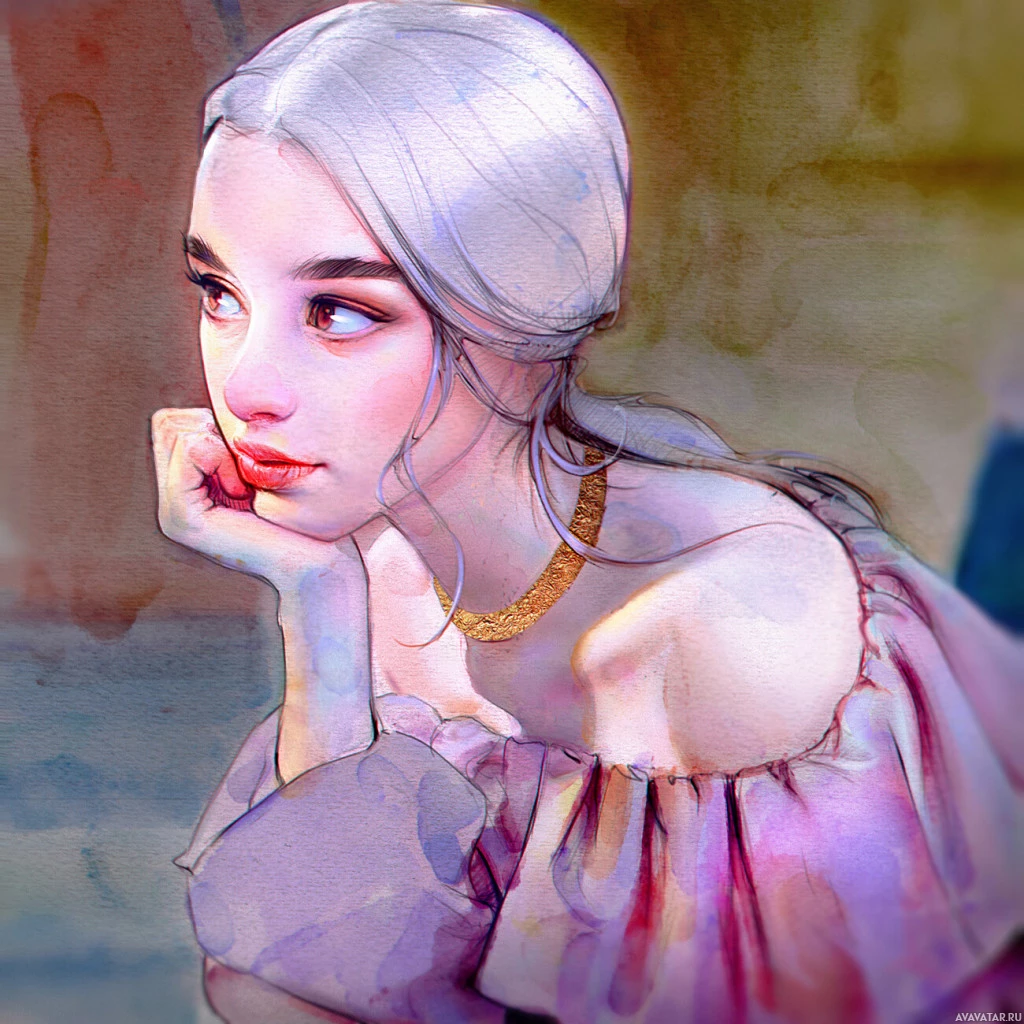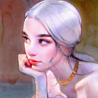 a young woman with blonde hair, wearing what appears to be historical or fantasy attire. She has her chin resting on her hand and is looking directly at the viewer, which gives her an introspective or thoughtful expression. The artwork has a soft, almost impressionistic quality to it, with visible