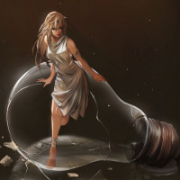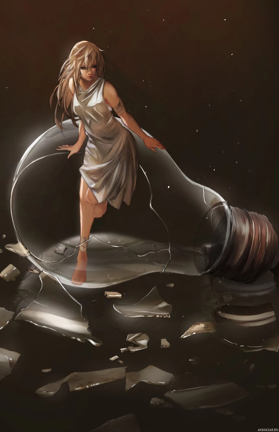 The image shows a girl, who appears to be blonde, interacting with a light bulb. She seems to have broken the bulb and is standing on shards of glass. The scene gives a sense of whimsy or surrealism due to the unusual circumstances involving the broken bulb.