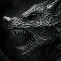 an open mouth, giving the impression of intense aggression or fury. The background is dark and textured, which contributes to the overall