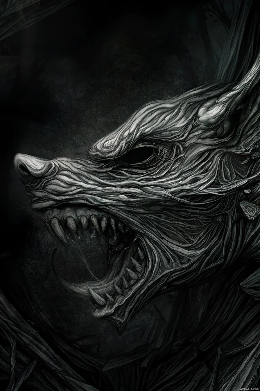 terrifying creature that resembles a wolf but is significantly distorted and deformed. It has an exaggeratedly large head with sharp teeth in