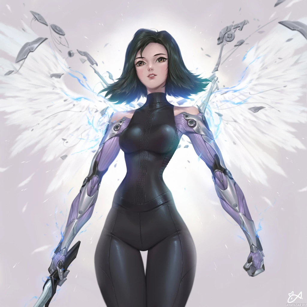 cybernetic enhancements, including mechanical arms and a purple armor-like bodysuit. Additionally, she is adorned with wings that seem to be part of her cybernetic enhancements. The art style leans towards realism with