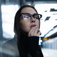 indoor setting. She is wearing glasses and has