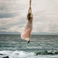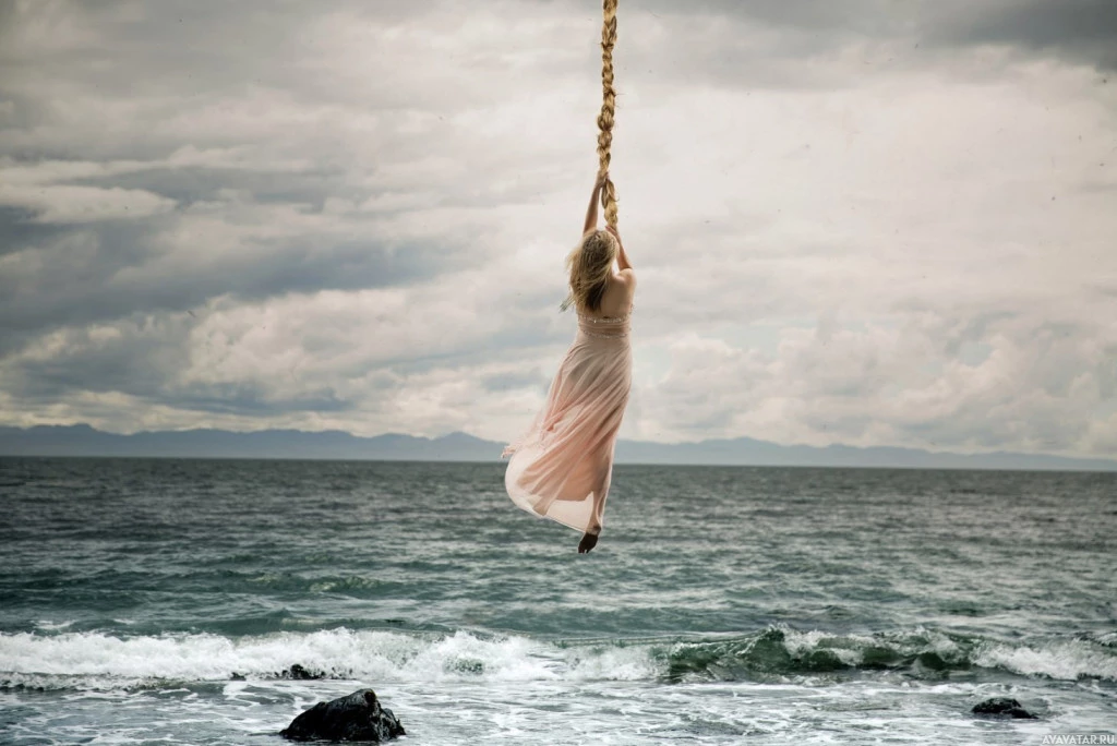 На картинке изображен человек, который кажется женщиной сзади, одетый в платье, висящий на веревке или баре. Она расположена у моря, а волны падают на заднем плане. Фотография имеет эфирное качество, возможно, из-за используемого освещения и цветовой палитры.