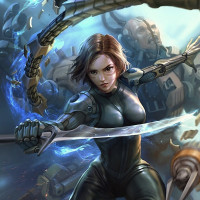 advanced technology and mechanical elements. Her attire includes a tight-