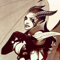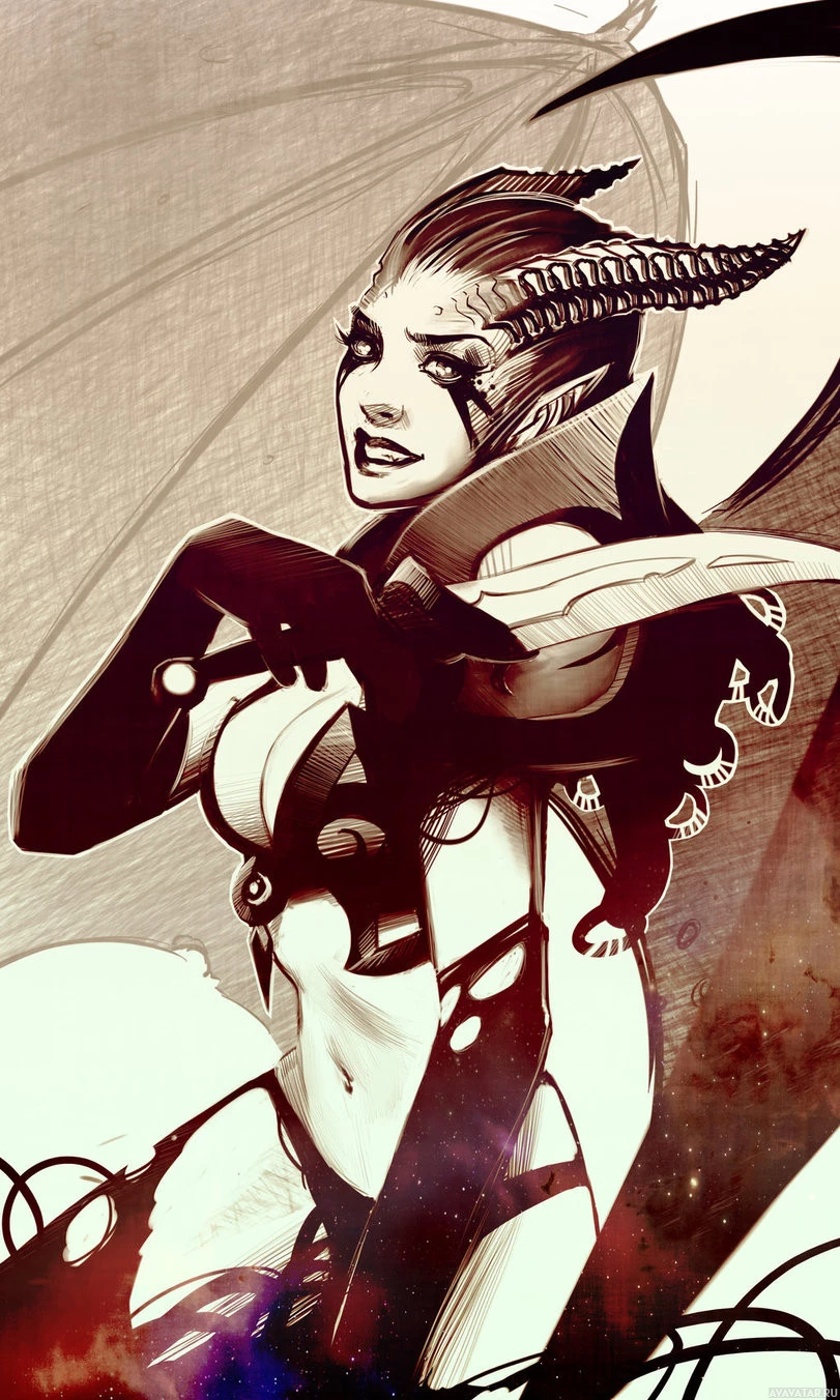 a female warrior with horns and what looks like armor or clothing, set against a cosmic background that suggests a battlefield in space. She has