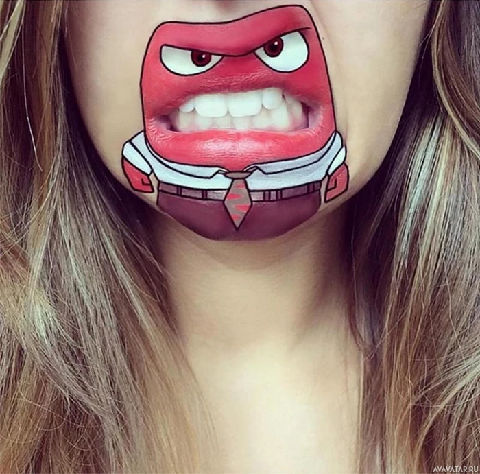 red lips with white teeth in an angry expression. It resembles the character's appearance from