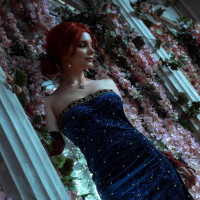 seated character's face is blurred out, likely for privacy or to maintain anonymity. This character could be associated with Triss Merigold based on their presence in the game's storyline.