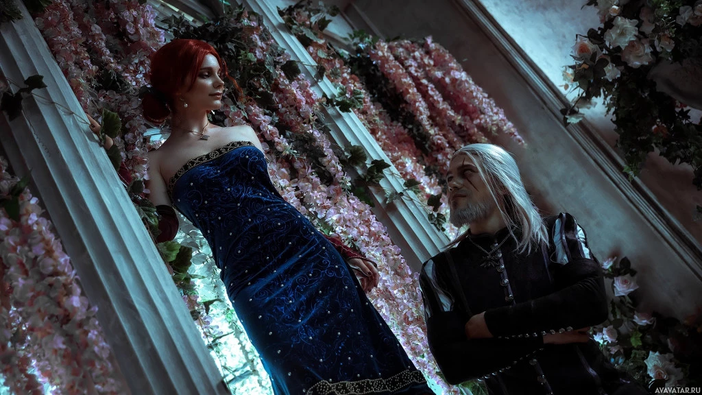 Triss Merigold, a sorceress and a key figure in the story of the game. On the right, another character is seated on what looks like a throne or raised platform adorned with
