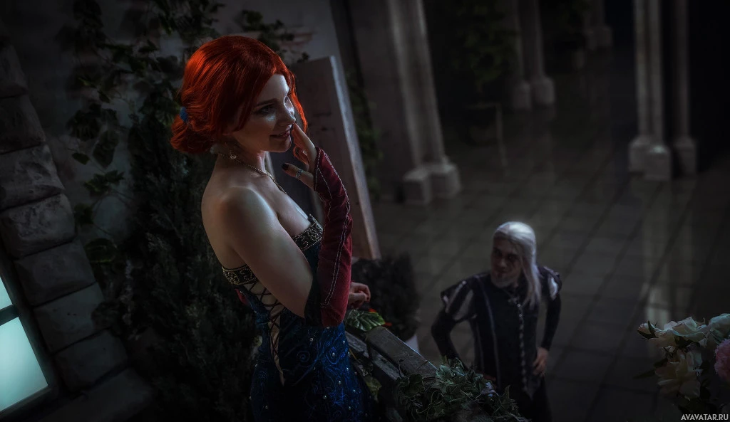 the video game "The Witcher 3: Wild Hunt," featuring two characters that are likely cosplaying as Geralt of Rivia and Triss Merigold. The character on the left is a woman with