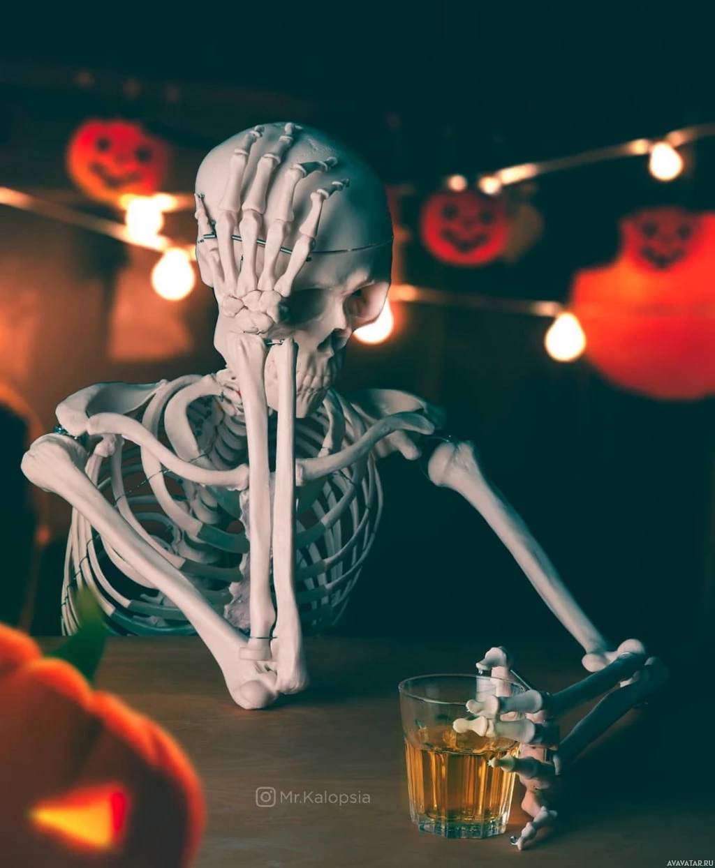 The image shows a skeleton sitting at a bar or table, seemingly distressed. There are Halloween decorations in the background, including pumpkins and lights that create