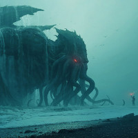 rocky terrain at the water's edge, looking towards the colossal structure in the background. The scene has a dark and ominous atmosphere, typical of horror or fantasy genres.
