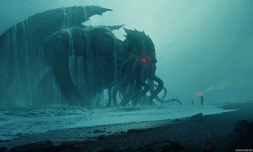 sea creatures that give the impression of a monstrous environment. In the foreground, there is a lone figure standing on
