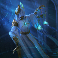 a powerful sorcerer or wizard. The character is holding a staff with a glowing crystal at the top and has