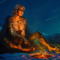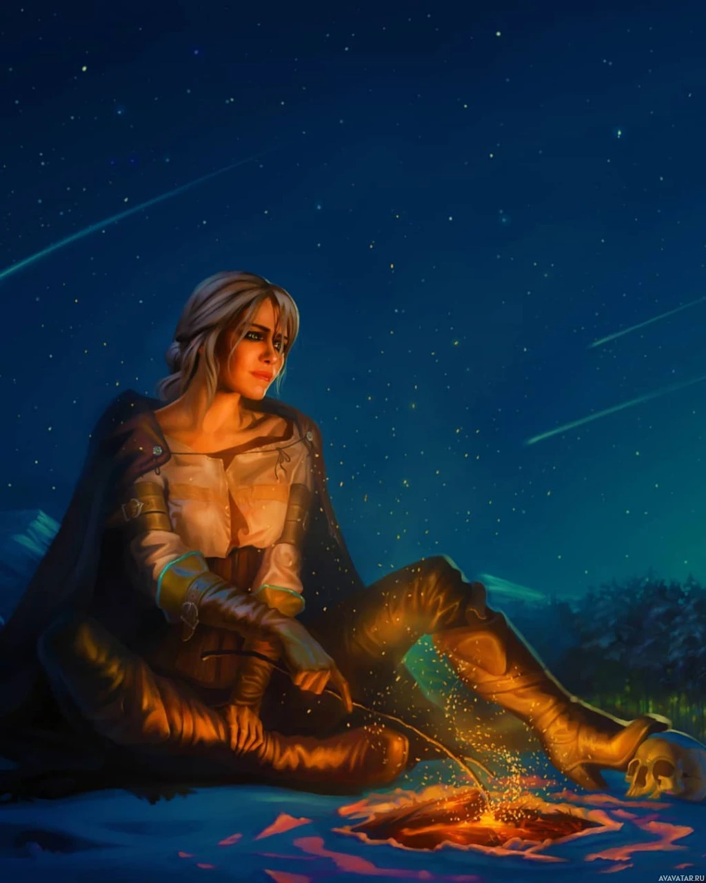 the video game "The Witcher 3: Wild Hunt." She is depicted sitting by a campfire in
