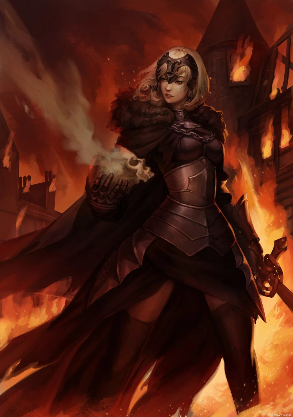 a fantasy setting. Her attire and the style of her hair give her an ethereal or otherworldly appearance. The background includes flames, which adds to the dramatic and intense atmosphere of the image.