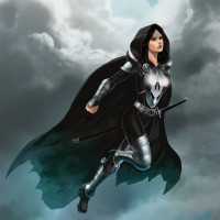 a cloudy sky with lightning bolts visible around her. The overall style of the image suggests it could be from a comic book or