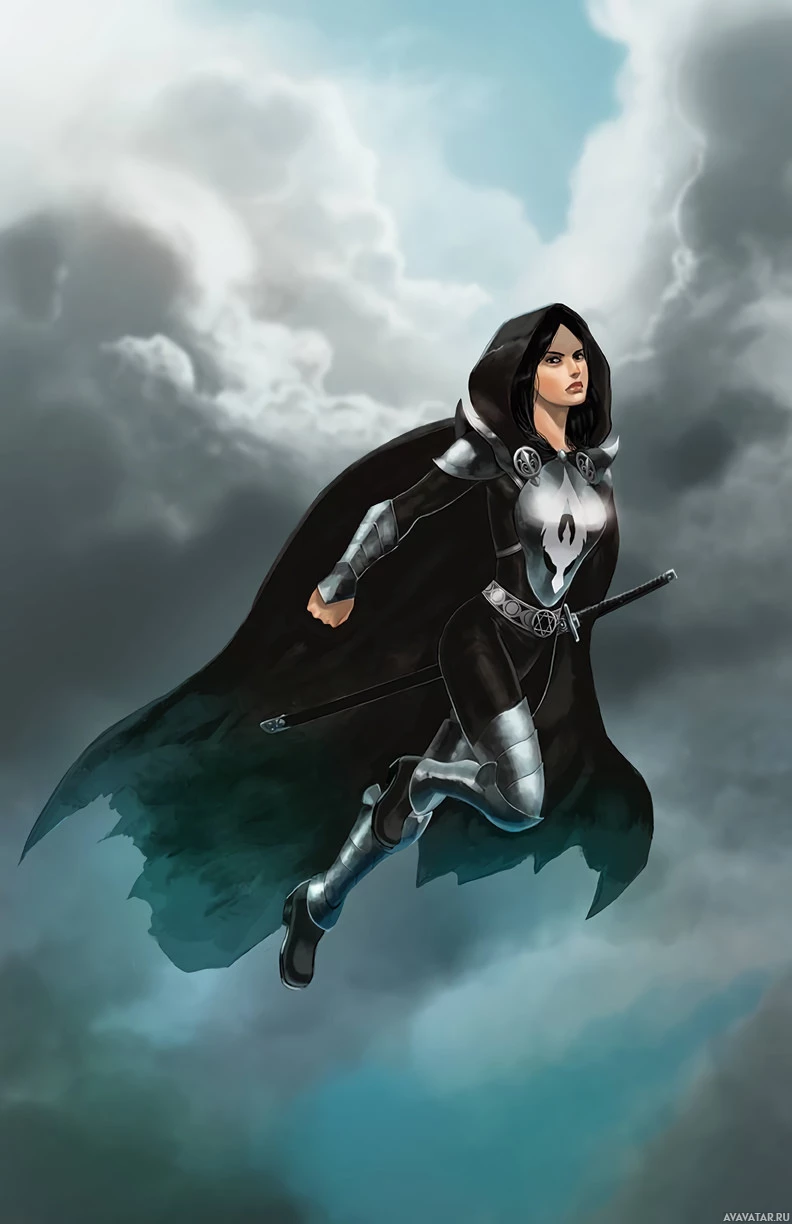dark hair and is wearing a cloak or hood, which is draped over her shoulders and fastened at the neck. The character is also depicted holding what looks like a staff or wand in one hand. Her expression is determined, and she seems to be flying or jumping through