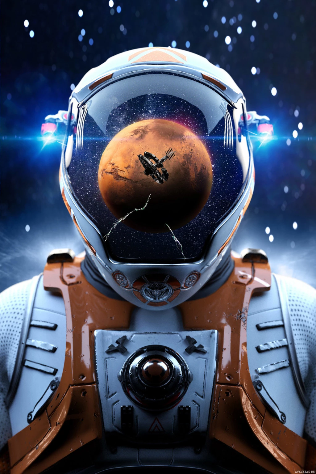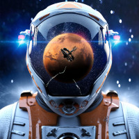 На картинке изображен астронавт в скафандре с планетой Марс, видимой через козырек шлема. Это художественное представление, вероятно, должно символизировать исследования, путешествия или космическую науку.
