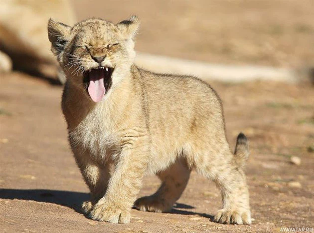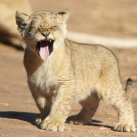 lion cub walking on a dirt surface. It appears to be in a natural,