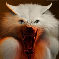 The image depicts a werewolf in a fantasy or horror context. The creature is shown with a menacing expression, its teeth sharply displayed as it bares its fangs. There are visible signs of blood around the mouth area, which might be indicative of recent aggression or injury. The style of the artwork gives it a dramatic and intense feel, fitting for a horror or fantasy genre.