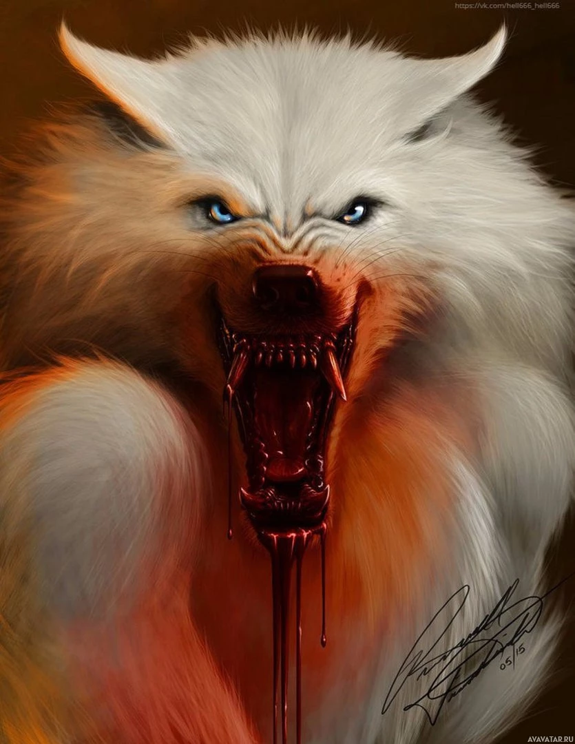 Картинка показывает оборотня в контексте фэнтези или ужаса. Существо показано с угрожающим выражением, его зубы резко отображаются, когда оно обнажает клыки. Вокруг рта есть видимые признаки крови, которые могут свидетельствовать о недавней агрессии или травме. Стиль произведения придает ему драматическое и интенсивное ощущение, подходящее для жанра ужасов или фэнтези.