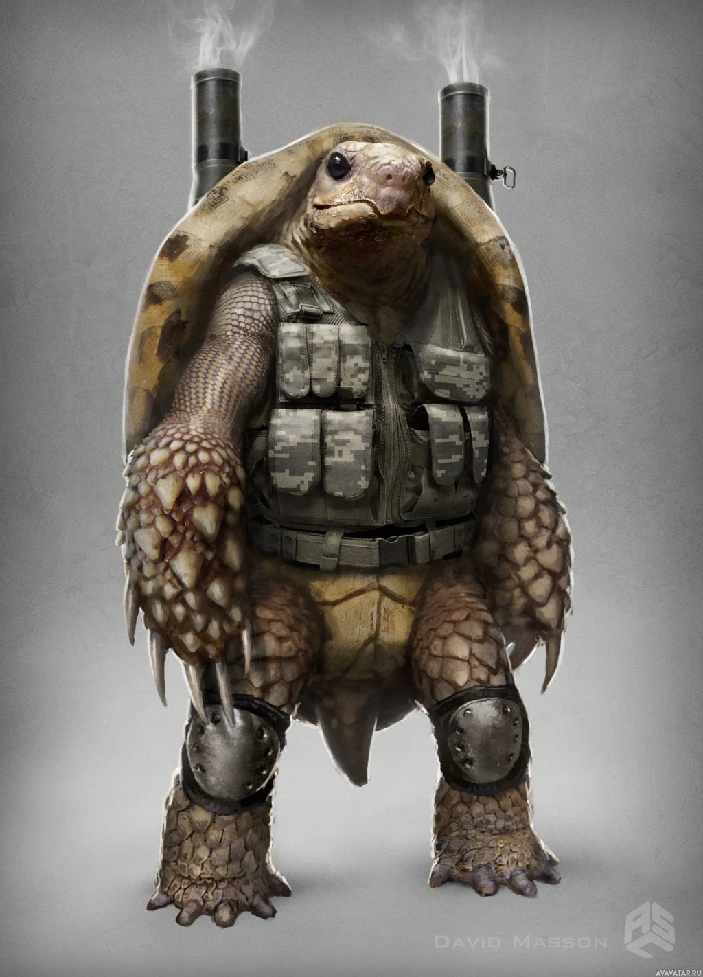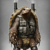 created character that resembles a turtle, but it has been depicted with human-like attributes. It is wearing a vest and appears to be standing upright on two legs. This character could be described as a mutant or