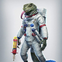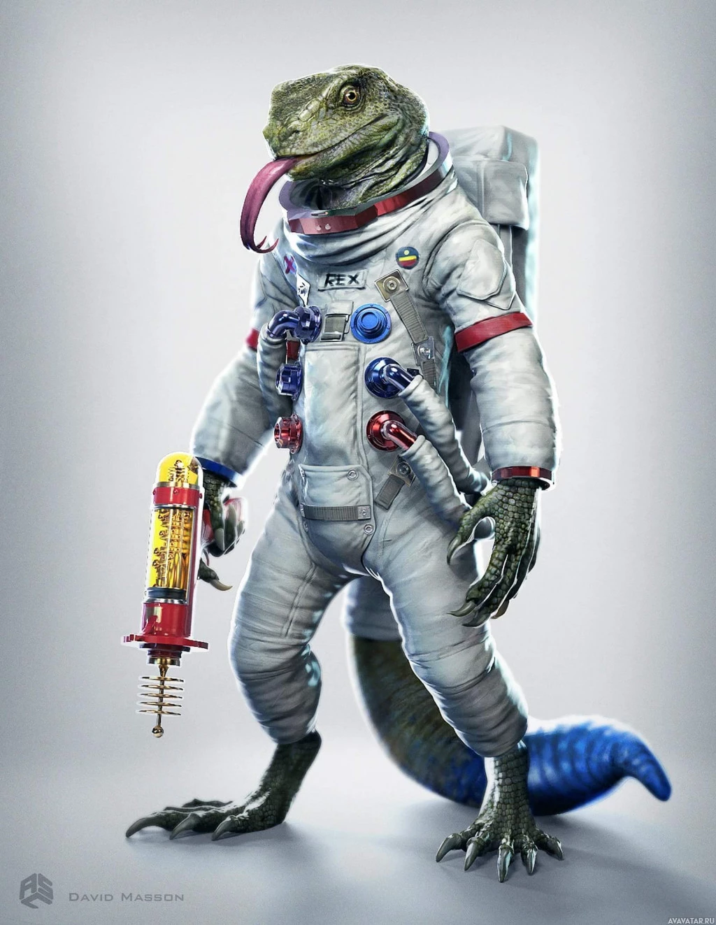 a combination of a human and a lizard. This creature is wearing an astronaut suit and appears to be standing upright on its hind legs like a human being, with the upper body and head of