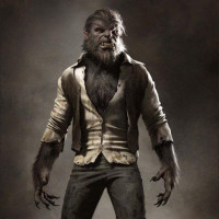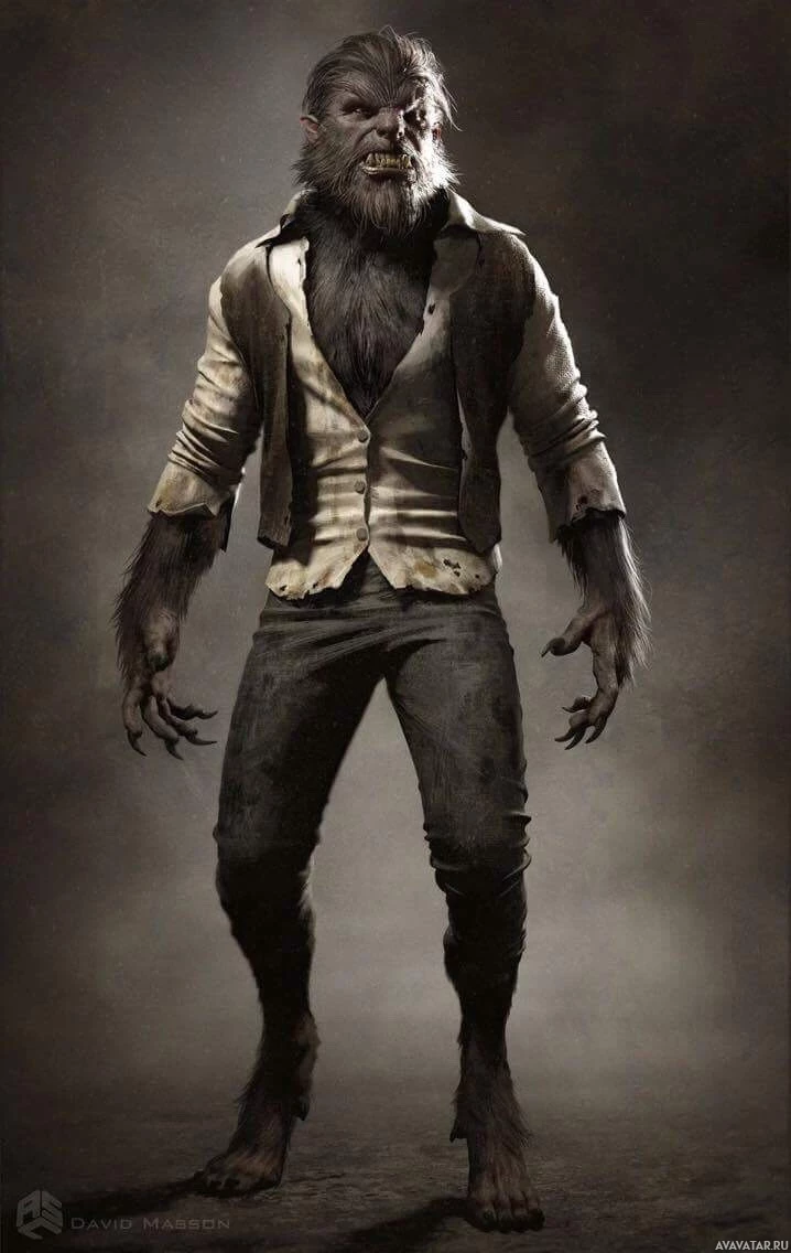 the body structure of a human but with animal-like features, such as fur and claws, which are characteristic of a werewolf. The creature is standing upright, wearing clothes that appear to be a mix of