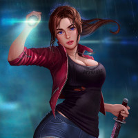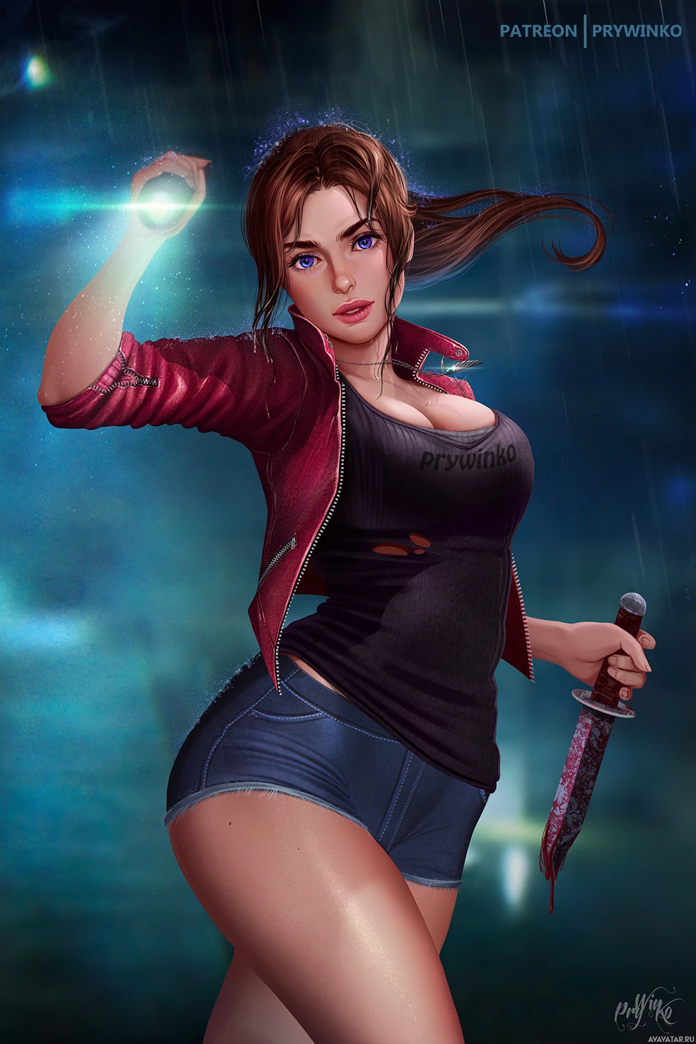 blue eyes, dark hair styled with a side sweep, and is wearing a red leather jacket over a black top with short sleeves, denim shorts, and boots. In her right hand, she holds a knife, indicating that she might be prepared for self-defense or an attack. Her left arm is extended towards the ground as if to balance herself or steady her stance. The background shows a rainy urban scene with dark skies and illuminated streetlights reflecting on wet surfaces, creating a moody and atmospheric setting that could be part of
